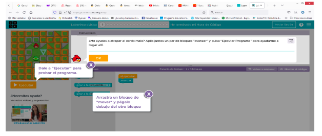 Pica en inicio y comenzarás el tutorial de 20 pasos, aprendiendo sobre los conceptos principales de la programación por bloques: movimientos, bucles, condicionales, etc…