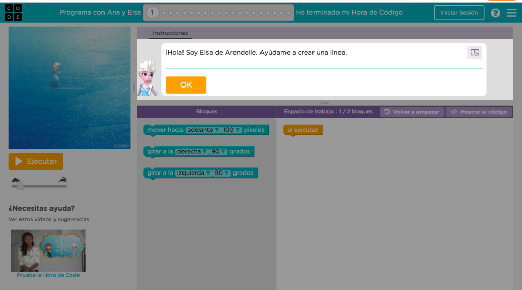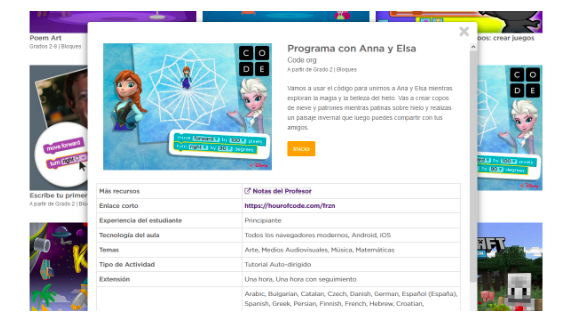 Entra de nuevo en www.hourofcode.com y selecciona la actividad de Frozen, Programa con Anna y Elsa: